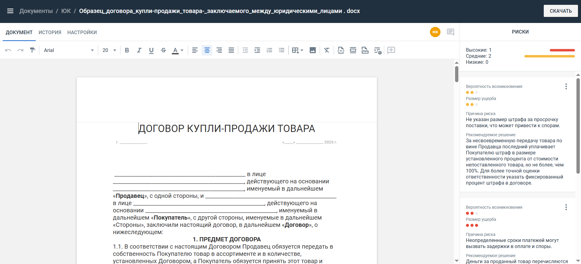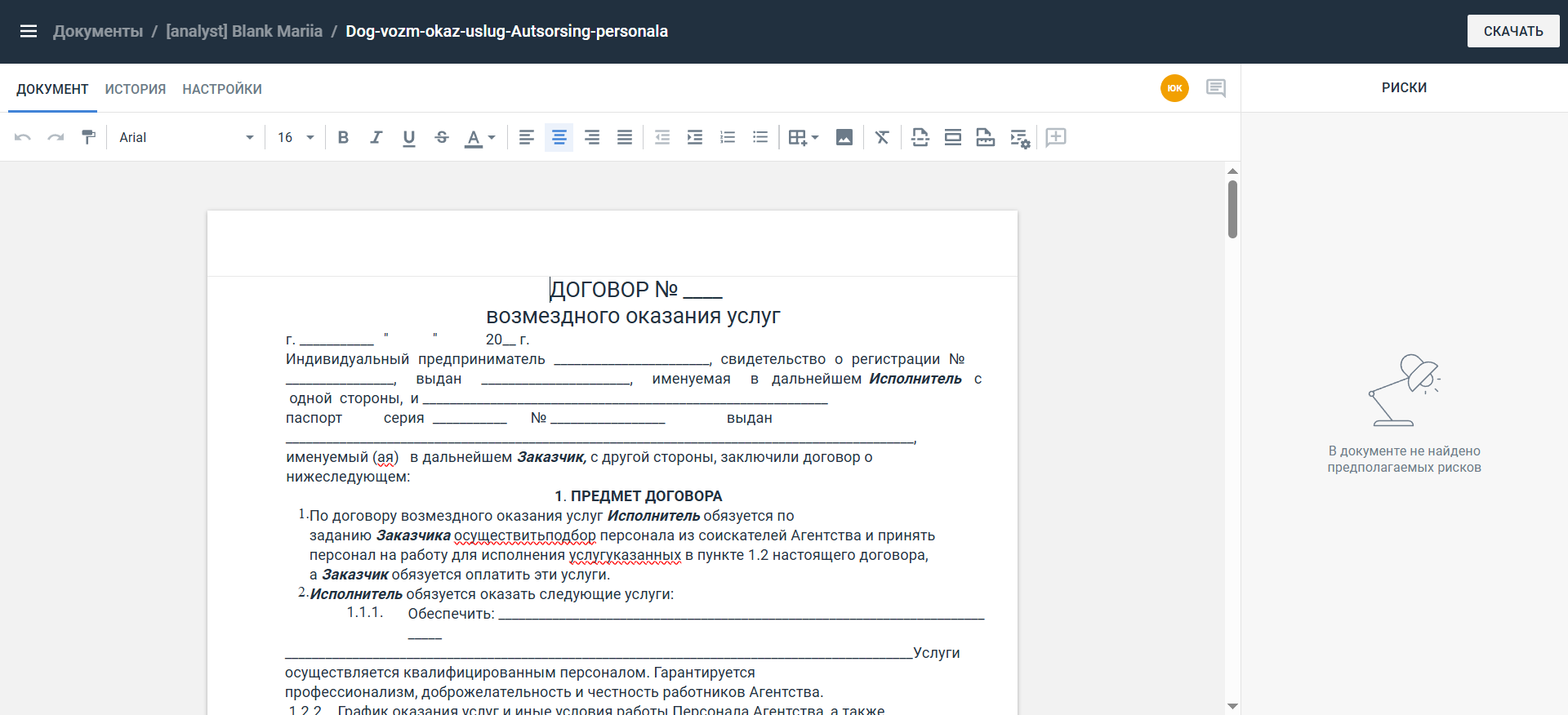 - Панель Риски справа. Если по документу не было найдено ни одного риска, отображается текст «В документе не было найдено предполагаемых рисков».