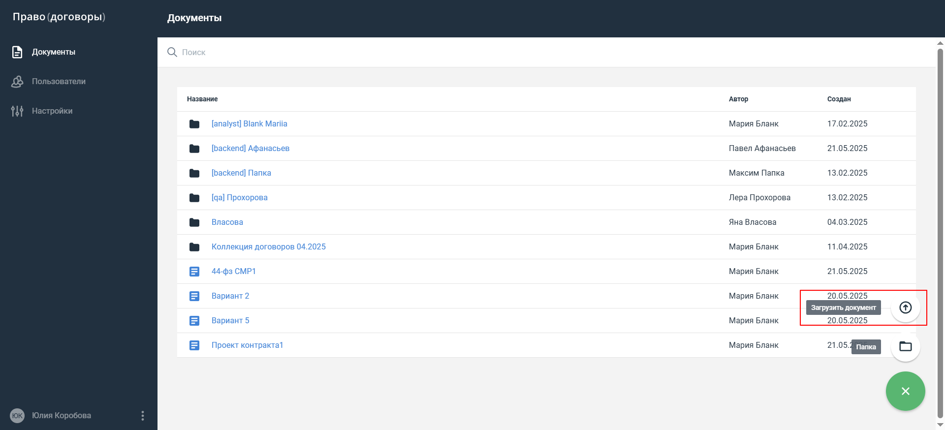 Загрузка документа и проверка на риски выполняются автоматически, вне зависимости от того, остался ли пользователь на текущей странице или перешел в другой раздел/другую папку. Документы можно добавлять в папки.