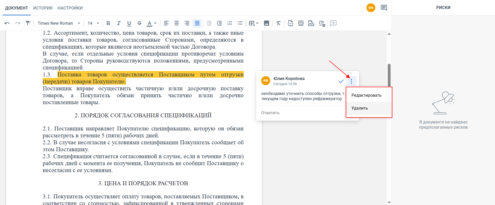 Система позволяет оставлять комментарии к чужим документам и отвечать на комментарии коллег.