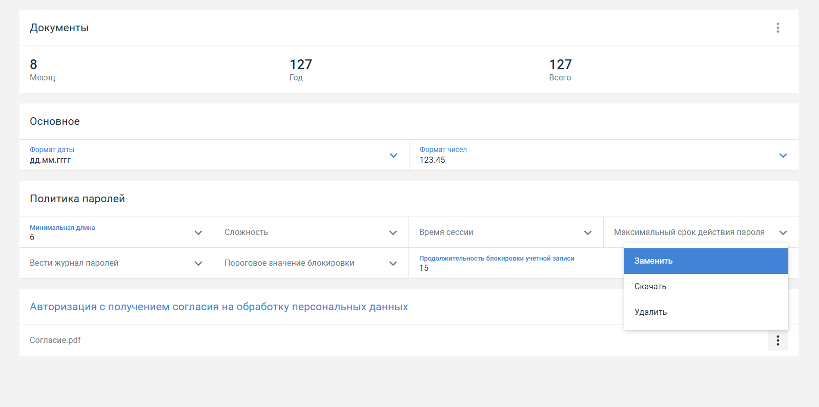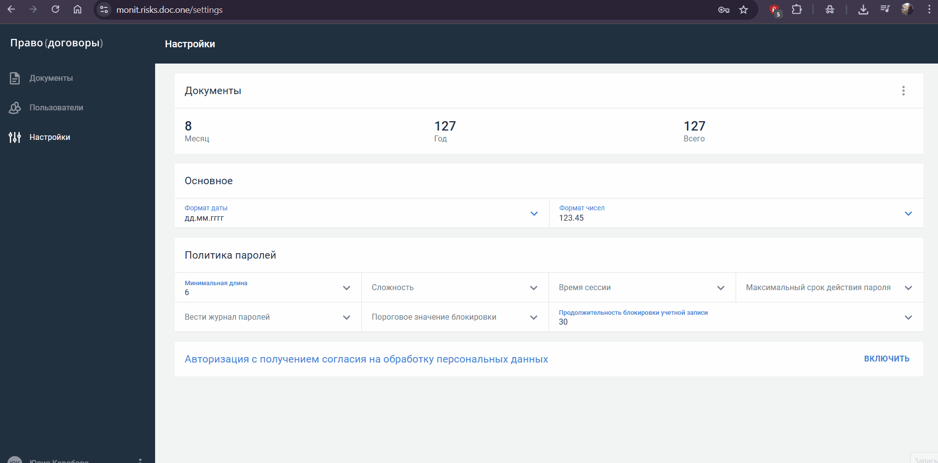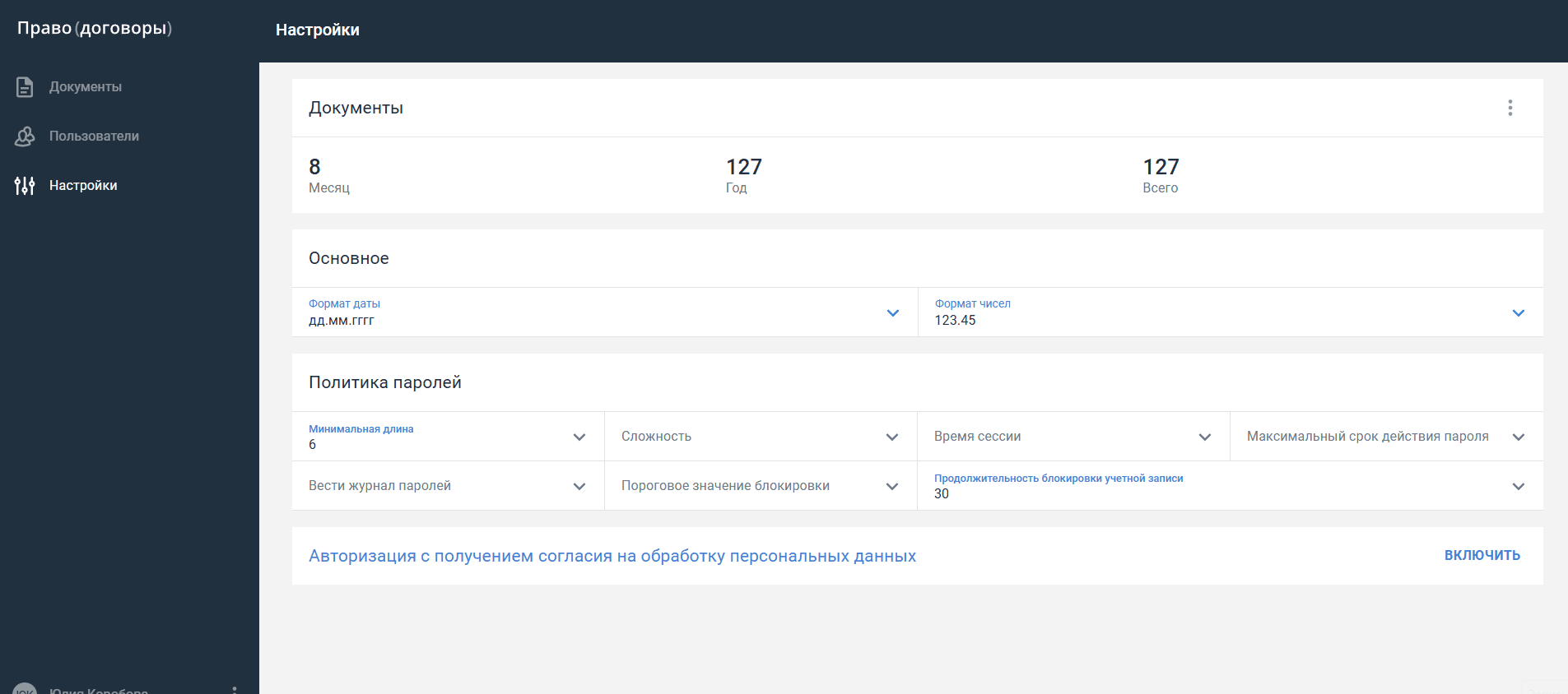 Можно настроить сбор согласий на обработку Персональных Данных (ПДн) пользователей системы в блоке Авторизация с получением согласия на обработку персональных данных раздела Настройки.