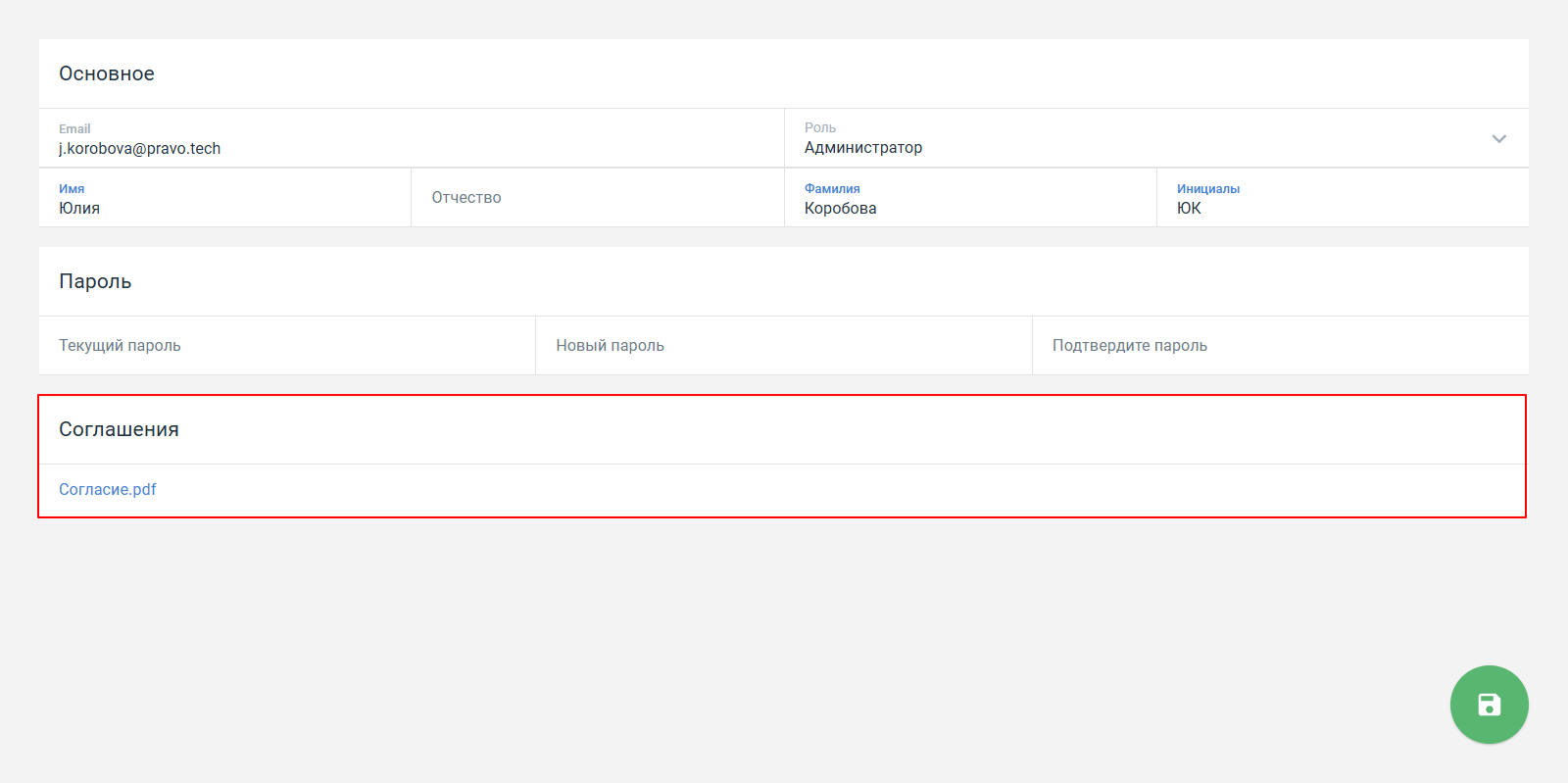Если настройка Авторизация с получением согласия на обработку персональных данных включена, в профиле пользователя можно скачать для ознакомления активное соглашение в блоке Соглашения.