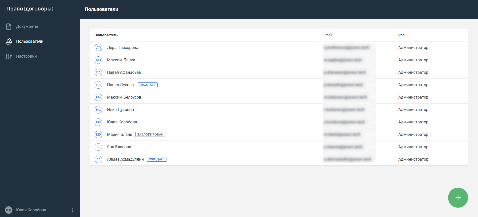 Откройте раздел Пользователи. Заблокированные пользователи выделены в списке отметкой "Заблокирован". Нажмите кнопку в строке выбранного пользователя.