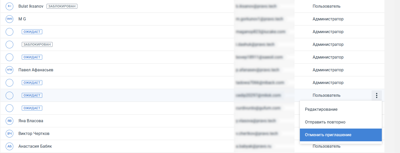 Выберите "Отправить повторно". Пользователю на почту придет письмо с приглашением. Статус "Ожидает" будет сохраняться до авторизации.